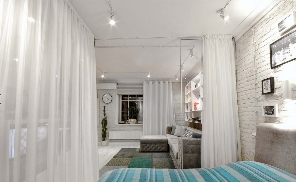 Decision:so that your gaze does not stumble over a dark or overly bright interior element in the center of the room, you should choose furniture or a partition in the color of the walls or floor. So the design will not get out of the general composition and attract too much attention.