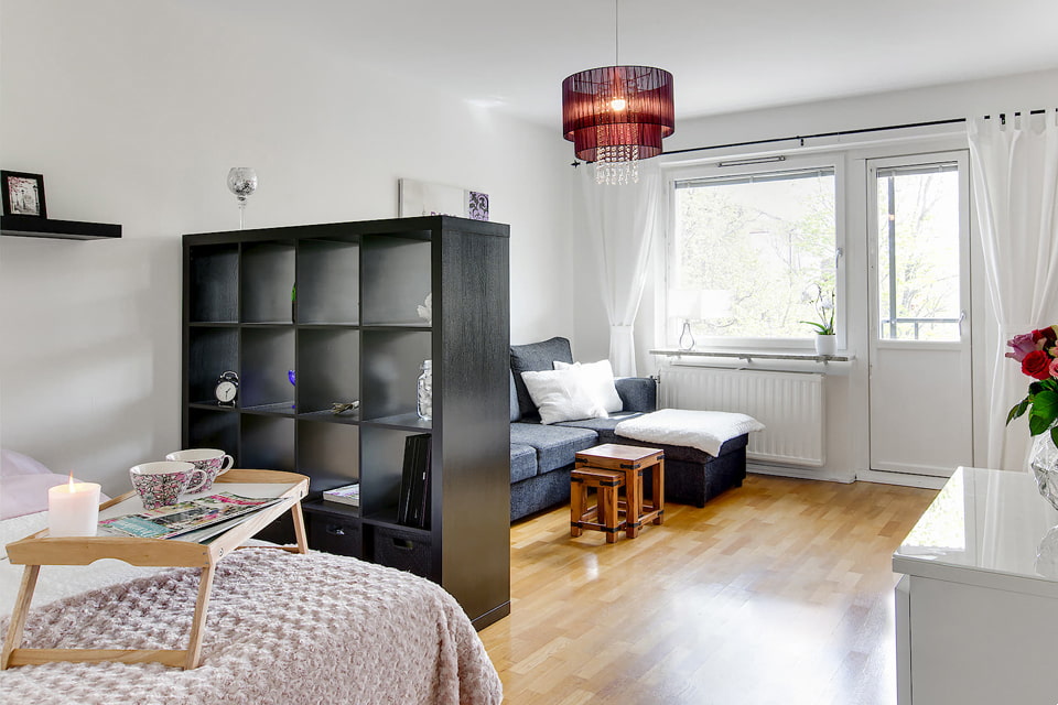 In addition, a partition or furniture that acts as a divider should ideally blend in with the surrounding space. A black shelf in the middle of a white room will look like a foreign object.
