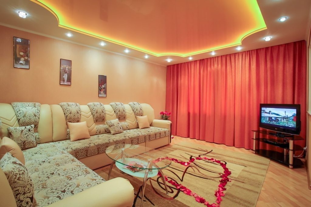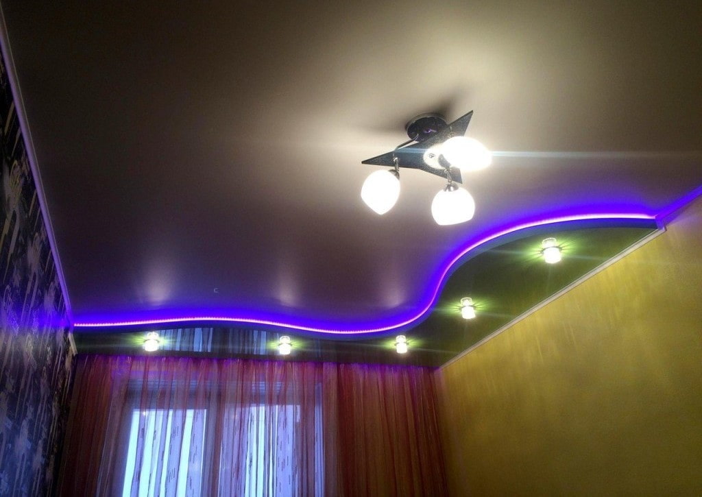 With the help of suspended soaring ceilings, you can place accents or highlight the necessary zones in the room, and thanks to the original lighting from LED bulbs, give it unlimited space.