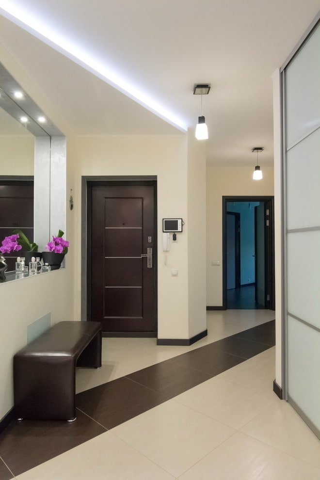 Stretch floating models will be especially appropriate in such a room. They visually expand the space, illuminate it perfectly and are aesthetically compatible with the general view of the hallway or corridor.