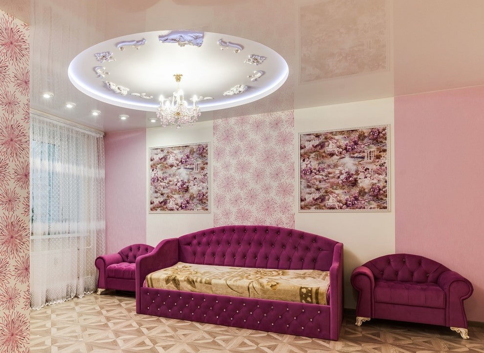 Matte, satin or glossy models in soothing colors will perfectly fit into the interior of the bedroom and maintain a calm and relaxing atmosphere in it. If there is a wardrobe in this room, then when installing tension structures, it should be borne in mind that they take away part of the height of the room.