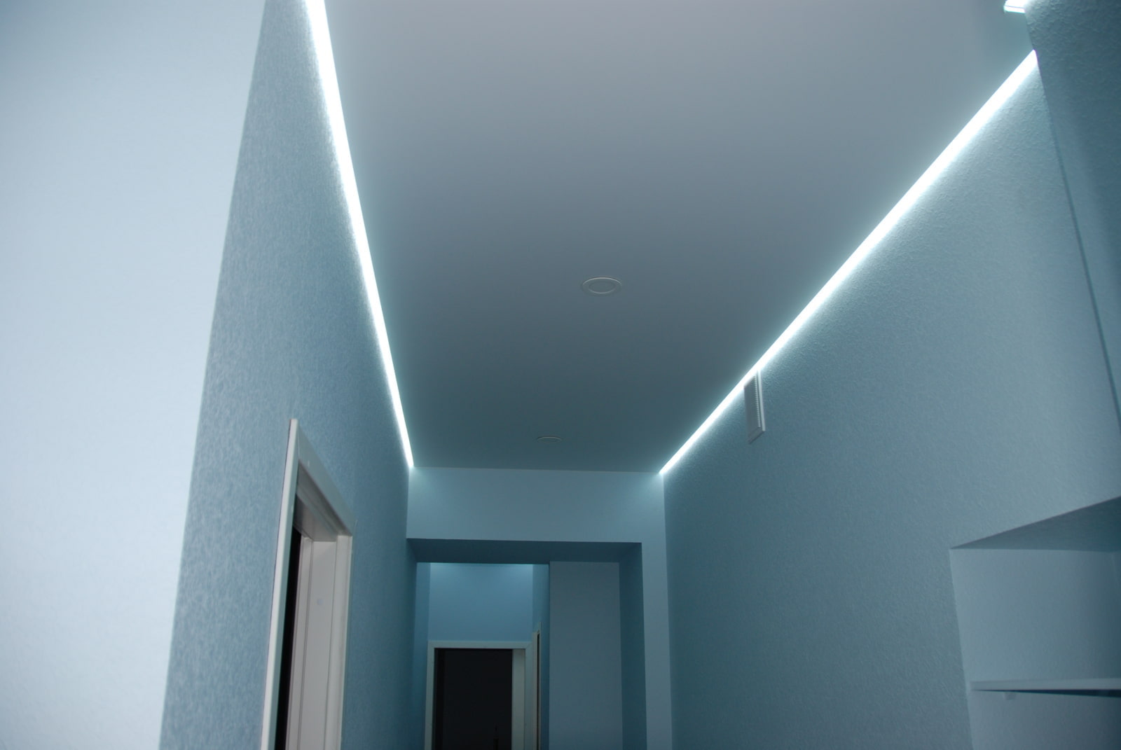 The photo shows a glossy single-level ceiling structure with lighting around the entire perimeter.