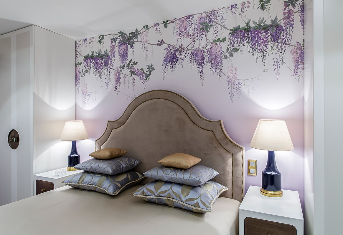 Delicate purple is successfully combined with white and gray. The perfect wallpaper tone for a classic or Provence style living space, the design will be fresh and cozy.