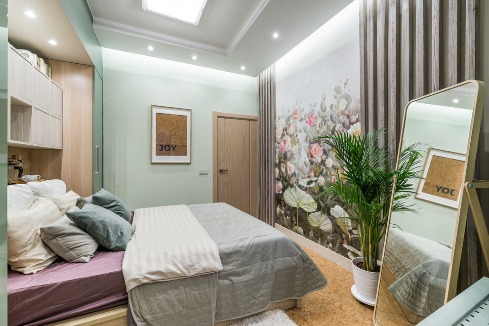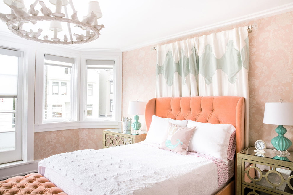 On the picture bedroom in mint orange colors. The walls are decorated with wallpaper with a small floral pattern combined with paint of the same tone.