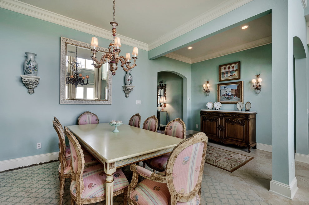 On the picture Provence style dining area. The walls are covered with pastel purple wallpapers in various forms.