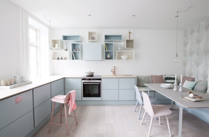 In addition to decoration, pastel shades can fill the interior due to furniture and other details, for example, an antique soft green wardrobe will become the main object in a bedroom, and a soft blue set made of wood in combination with linen textiles will make the kitchen sophisticated and romantic.