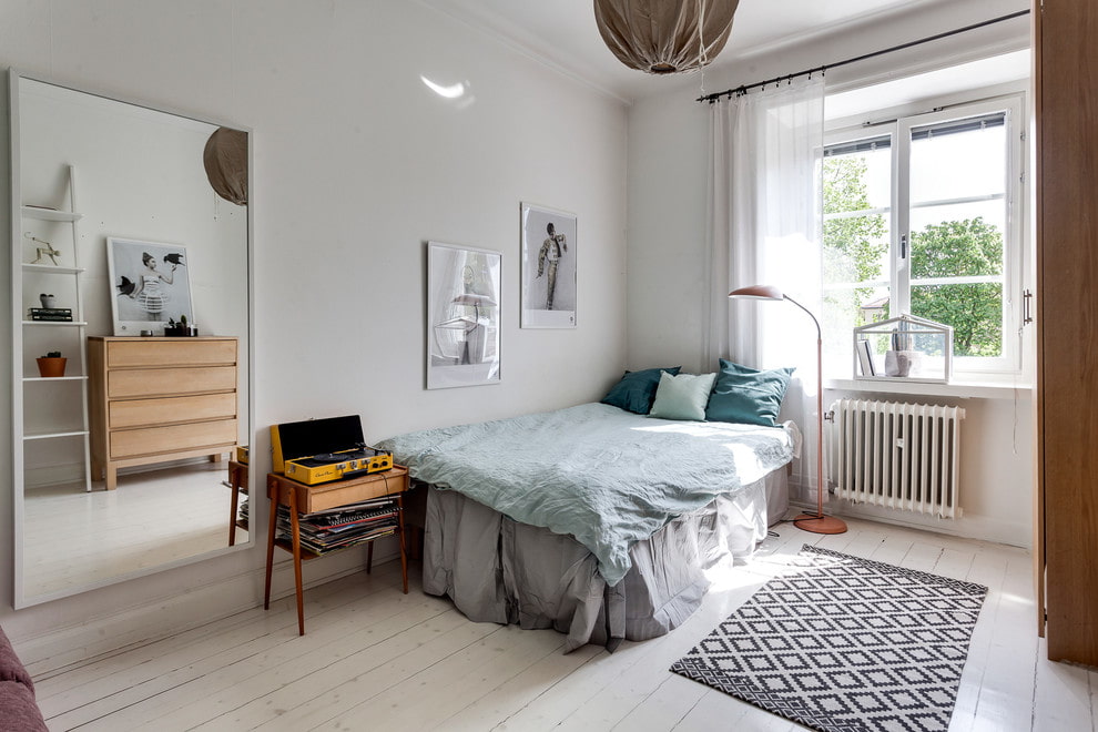 If more than one person lives in the room, zoning will be needed: a rack placed across the room, a sofa deployed with a back, a curtain as a partition will do. Pay attention to corners - they often remain unused and the usable area is reduced.