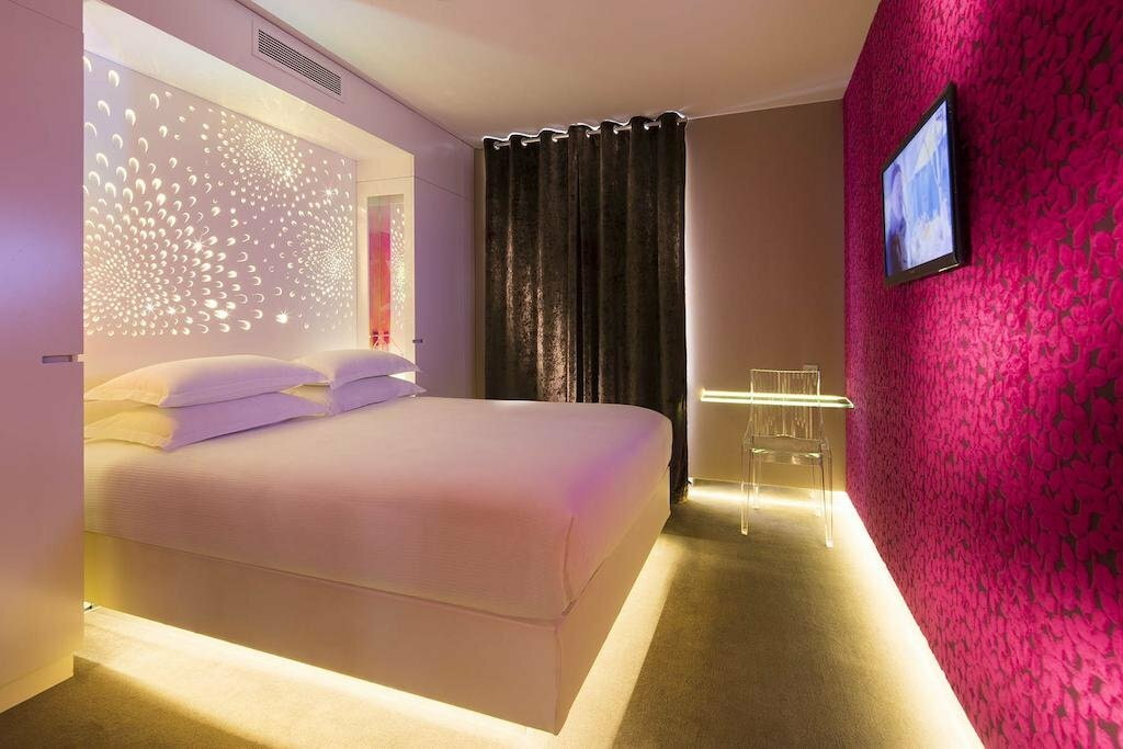 The photo shows the design of a bedroom in an apartment with floor illumination with light modules installed under the bed.