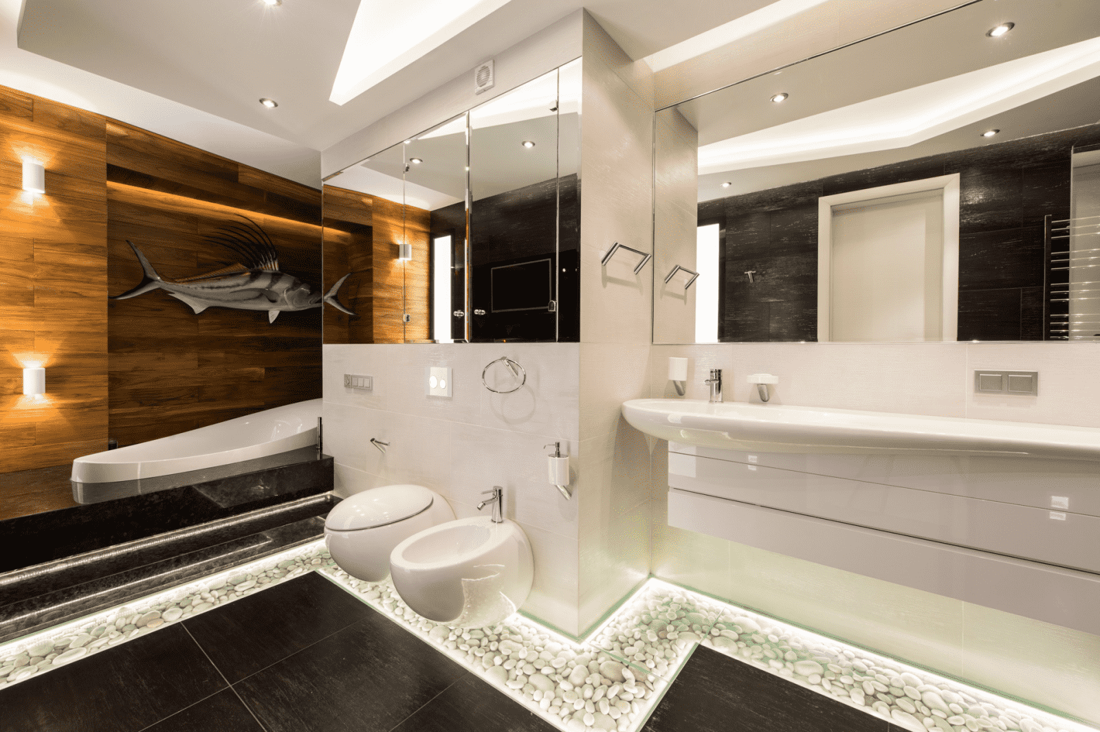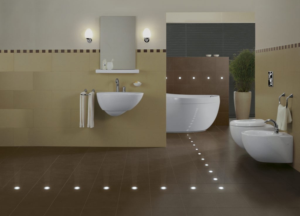In the bathroom, which has a modest area, with the help of floor lighting, you can visually increase the space. Floor lighting is advantageously combined with hanging fixtures. Due to this design, it is possible to enhance the floating effect of plumbing fixtures and achieve a soft level of illumination, pleasing to the eye, especially at night.