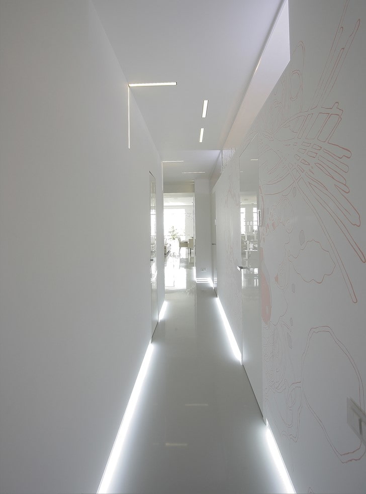 In the hallway, they use lighting around the perimeter of the room, illuminate the inter-tile gaps or separate segments of the floor. The installation method and the type of lighting fixtures depend on the intended effect.