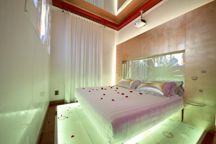 The sleeping area can be highlighted in white or another shade that matches the surrounding design. Bottom lighting expands the space, changes the appearance of the room and adjusts its shape. Many people equip floor lighting with a motion sensor. Thus, when entering the bedroom or getting out of bed at night, the lamps will automatically turn on with a soft glow that does not interfere with the sleeping person.