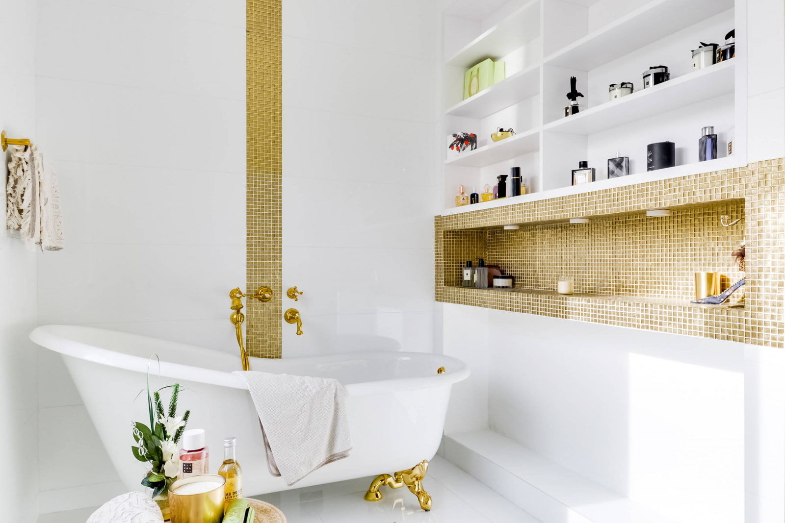Stone shelves are used to create a luxurious design.Combined with an identical floor finish, they add a touch of style to the room.