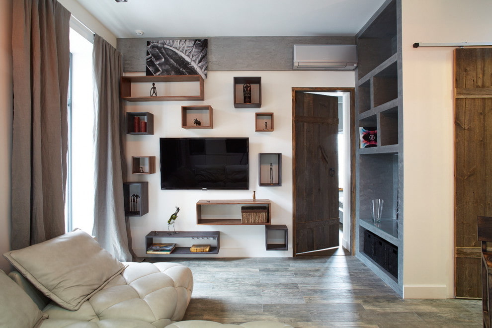 In the photo, the shelves on the wall in the form of cubes and rectangles in the living room.