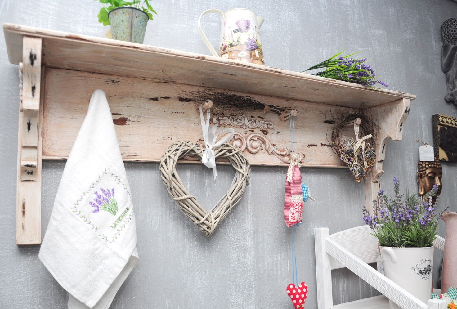 In the photo, the shelf on the wall is made of aged wood in the Provencal style.