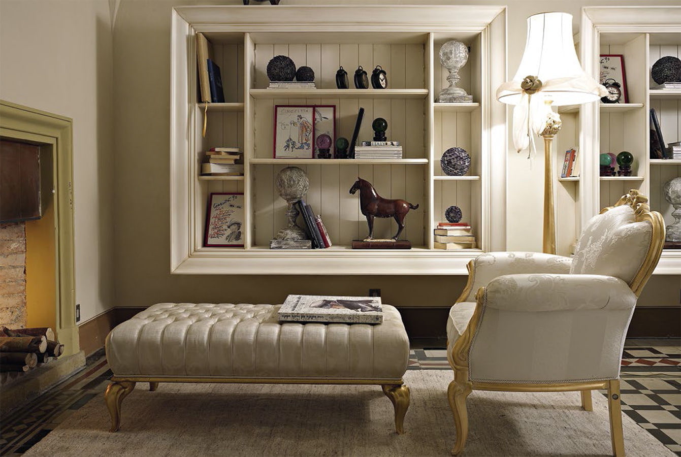 In the photo there are multi-level shelves on the wall in a classic-style interior.