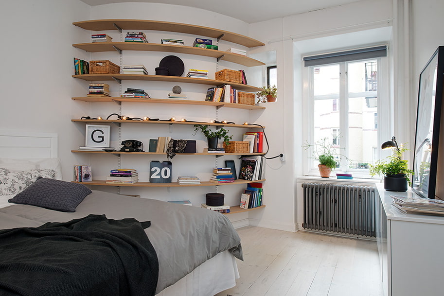 Pictured is a Scandinavian-style bedroom with wooden shelves on a semicircular wall.