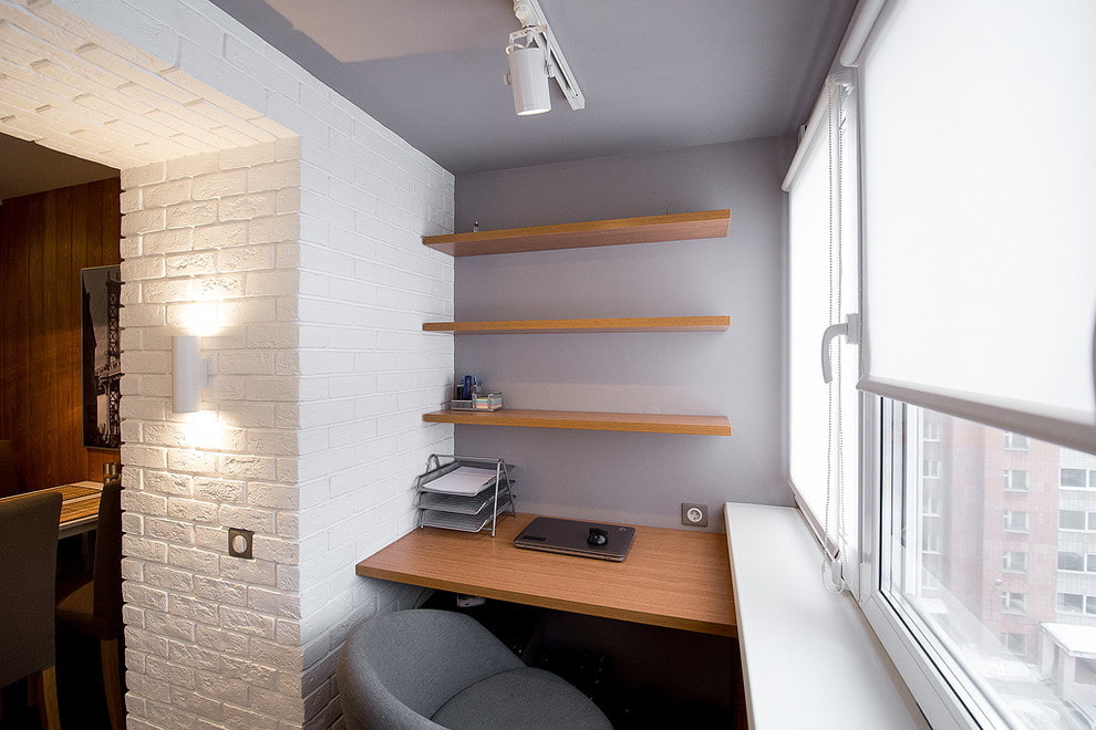 The balcony is equipped with utility shelves with doors. Products contribute to maintaining the necessary cleanliness and a certain order on the loggia.