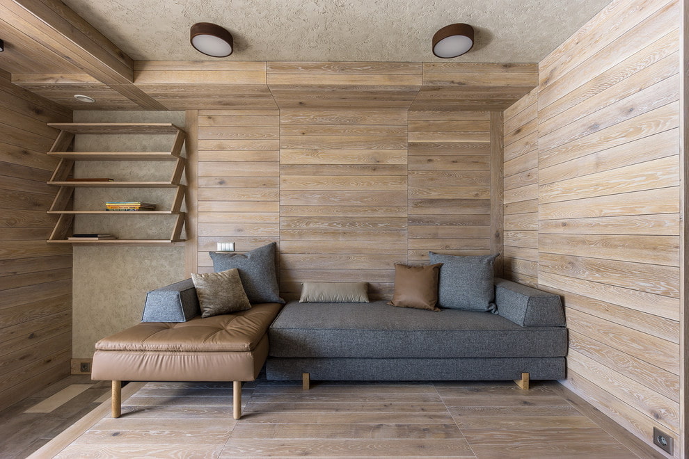 The photo shows the interior of the kitchen-living room with a wall decorated with wooden zigzag shelves.