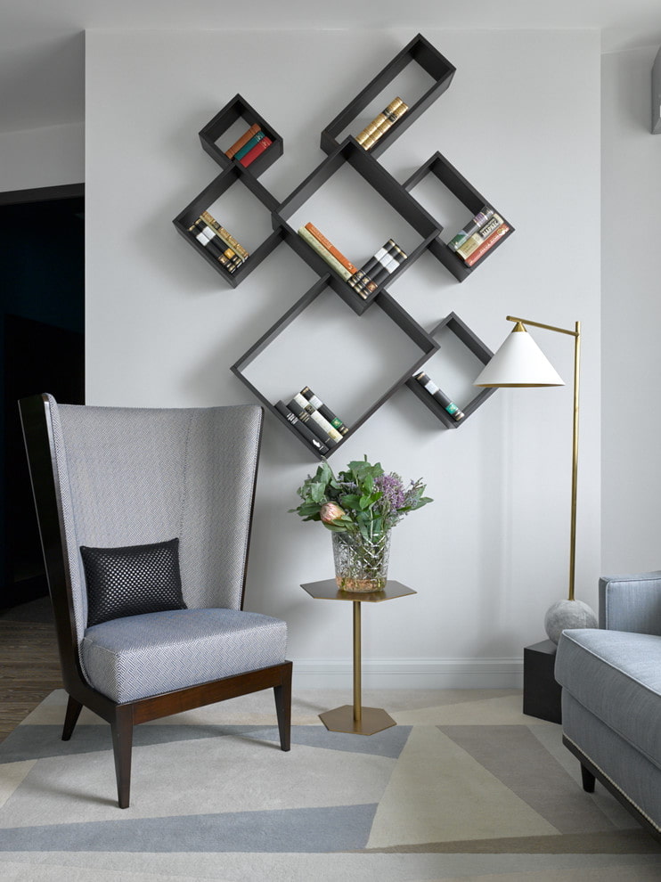 The photo shows an asymmetric shelf on a closed wall in the design of a modern living room.
