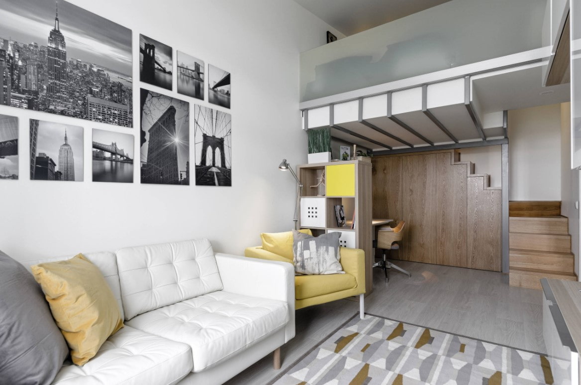 - Recurring plus new. Unlike the second scheme, there is still a color used in the interior, but it is diluted with a new fresh shade. Example: gray living room with yellow accents complemented by a yellow and blue print.