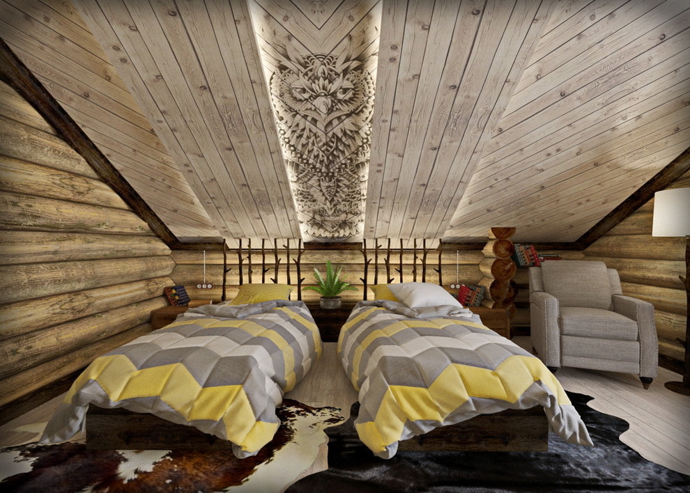 Natural materials in natural colors or wooden beams in a natural shade are an indispensable decorative element of a chalet-style attic in a wooden house.