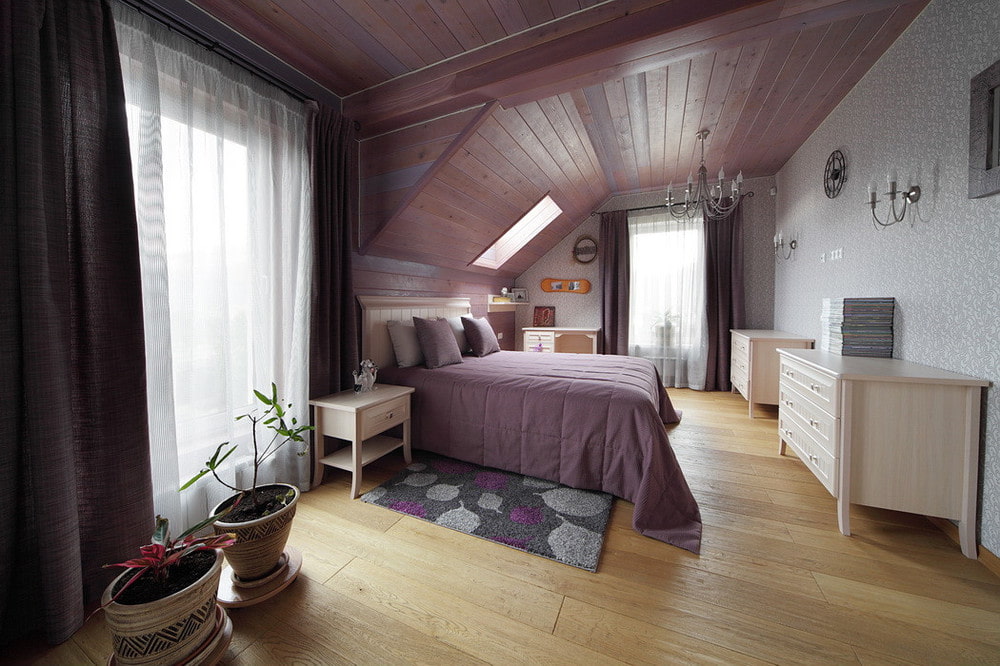 In the photo there is a wooden ceiling with a window, painted in lilac color in the interior of a bedroom in the attic.