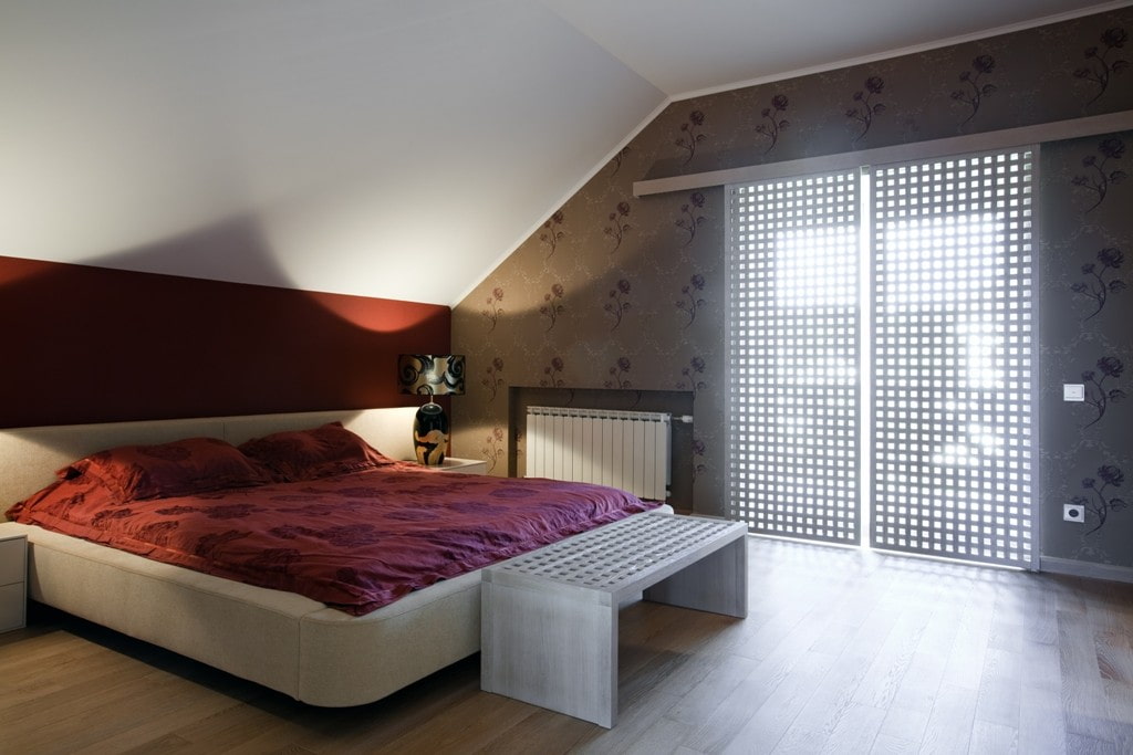 Stretch canvases in light shades will form a stylish and modern design in the bedroom, fill it with air and add more space to the attic room.