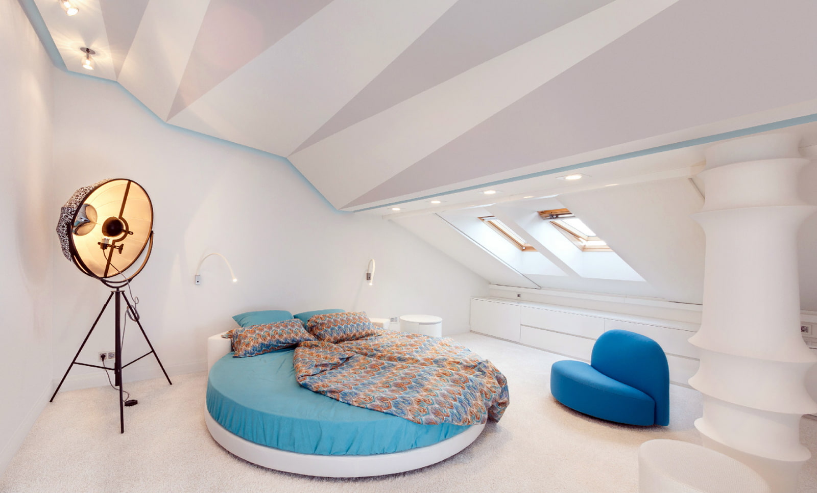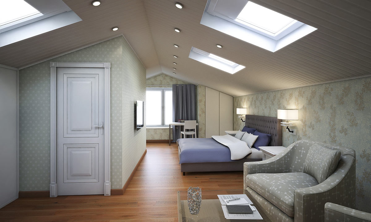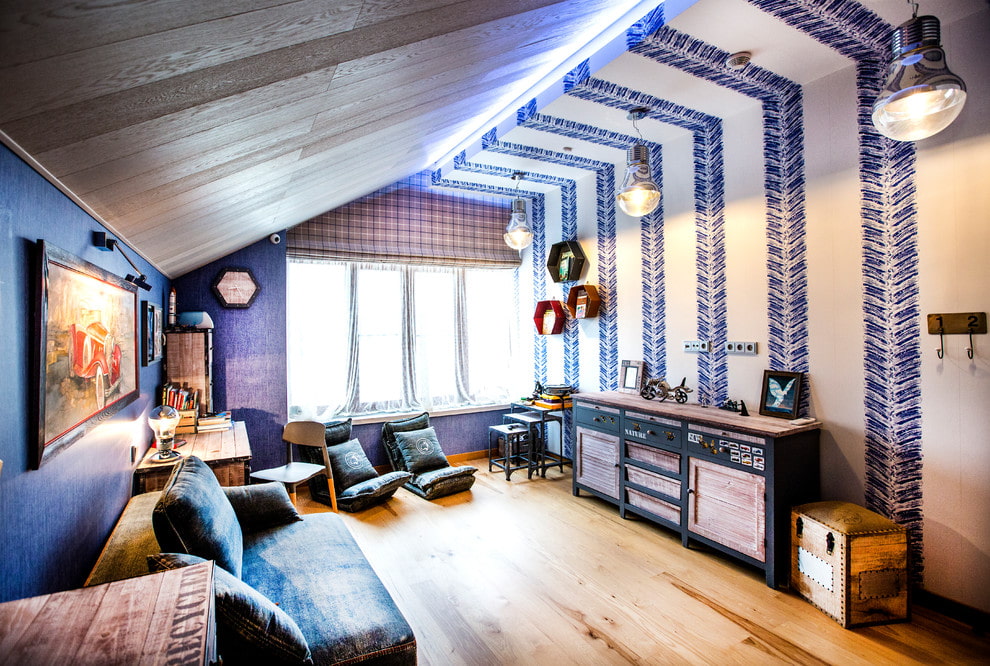 - A sloped roof takes up more space, so this room needs more light, which can be created with the help of competent artificial lighting.