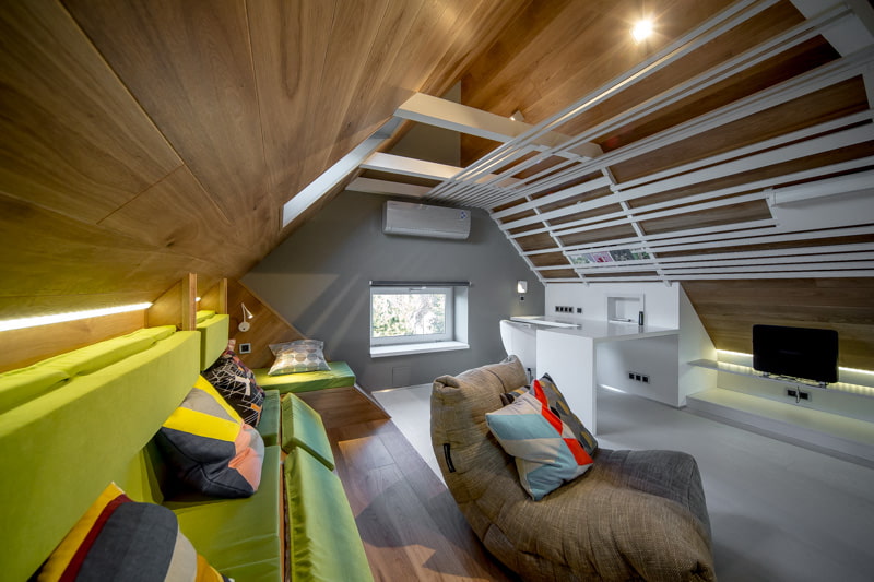 The carefully designed design of the attic ceiling will add comfort to the living room, make it more open, modern and visually attractive.