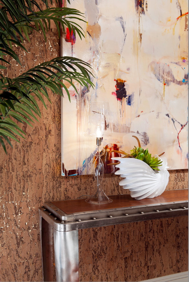 The interior can be combined with cork and vinyl wallpaper with a beautiful pattern or imitation of Venetian plaster.