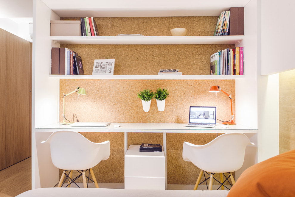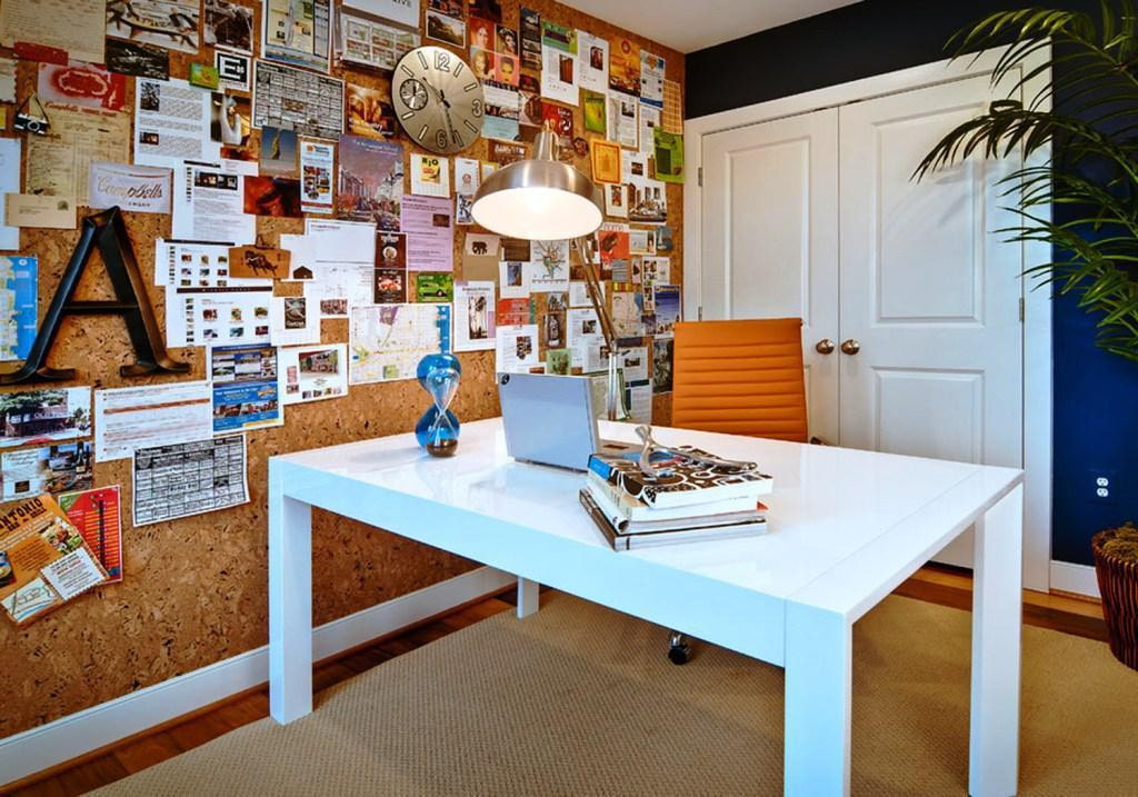 It looks interesting to decorate the walls with a cork covering, passing to the ceiling. This technique makes the room taller and unites the planes.
