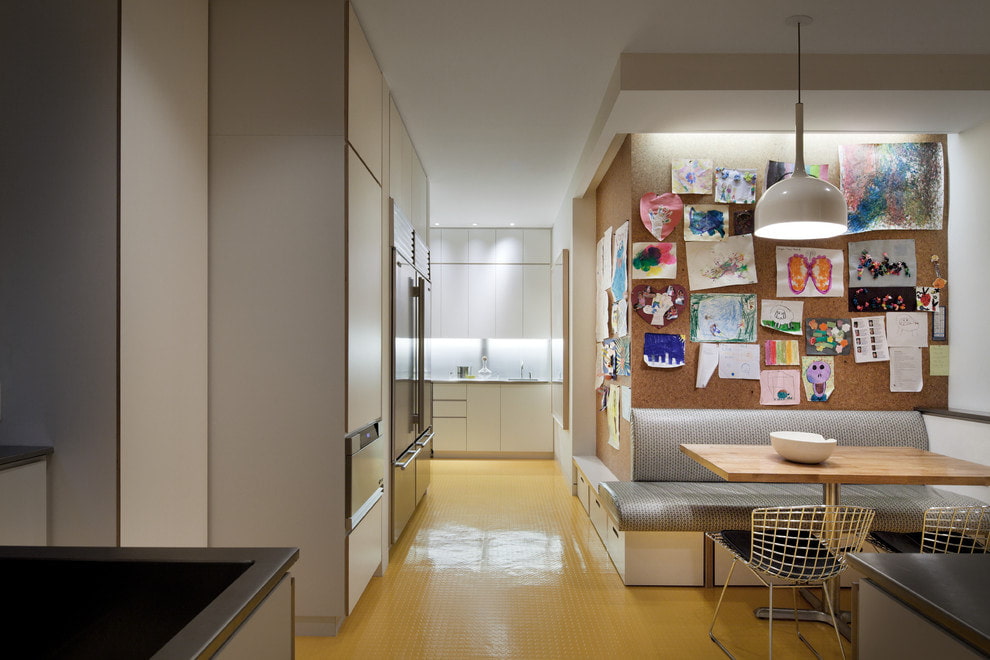 On the picture minimalistic kitchen in light colors. The corner wall, finished with cork wallpaper, is convenient for placing children's drawings and souvenirs.