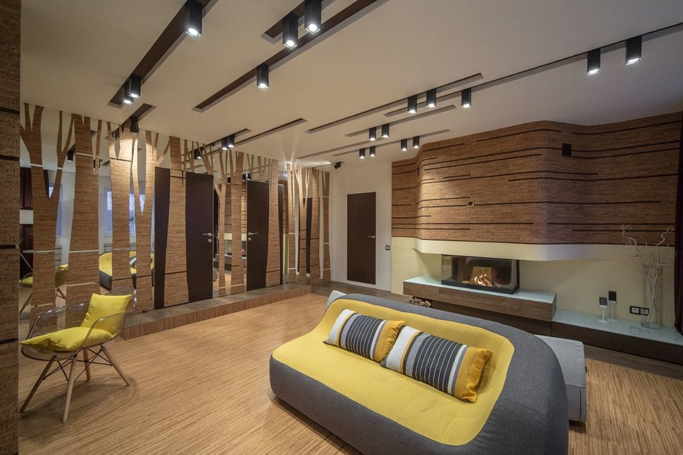 On the picture living room with sophisticated wall decoration made of cork, liquid wallpaper and mirrors. The combination of materials makes the space bigger and more interesting.