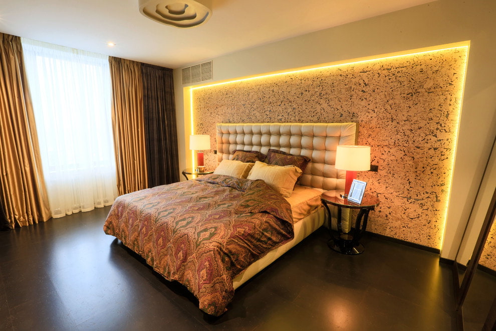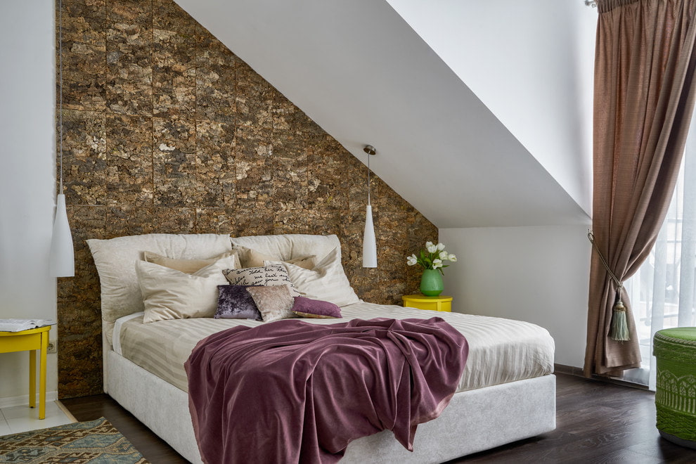 A fun way to decorate a bedroom. Cork wallpaper has a soft warm surface and is perfect for decorating the bedside area, for example, at the head of the bed. The cork flooring will harmoniously look in the interior of a modern, country and eco style.