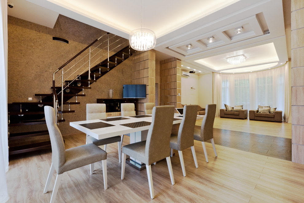 On the picture interior in modern style. A strip of cork wallpaper on the ceiling visually stretches the space without making it dark.