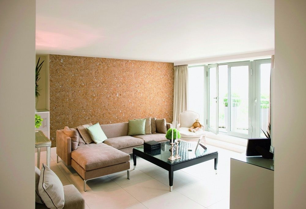- With plaster. A smooth plastered wall will look good with textured cork. This combination can decorate a living room, bedroom or corridor. The combination is neutral, calm.
