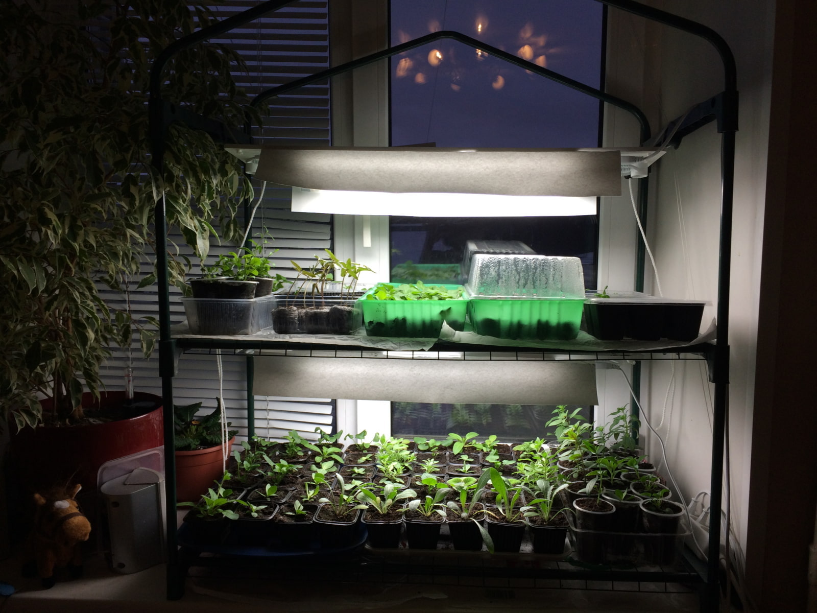 The main plus shelving in the fact that on a multi-tiered structure, you can fit a lot of containers with seedlings, and after the end of growing, use it as a storage system for other things.