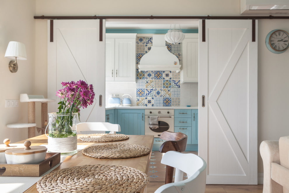 Sliding doors made of natural wood or chipboard, in whitewashed shades, pure snow-white or pastel colors, products with glass inserts decorated with engraving, lattice, floral patterns or antique paneled canvases will add a noble charm to the Provence style interior.