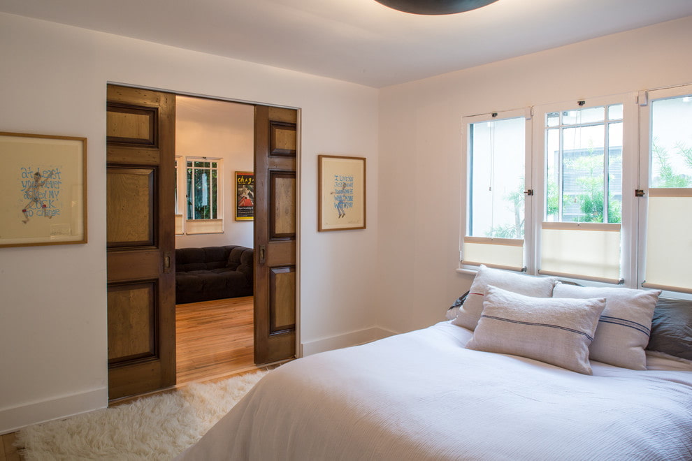 In the photo there are white matte pencil case doors that slide into the wall, located between the kitchen and the living room.