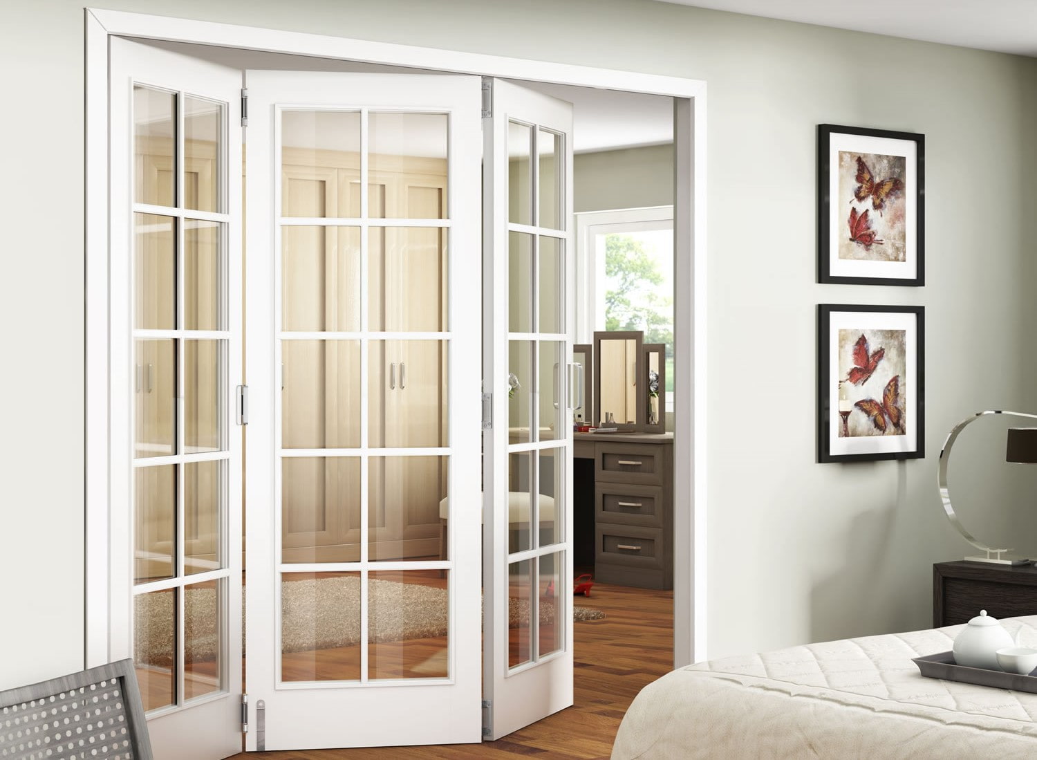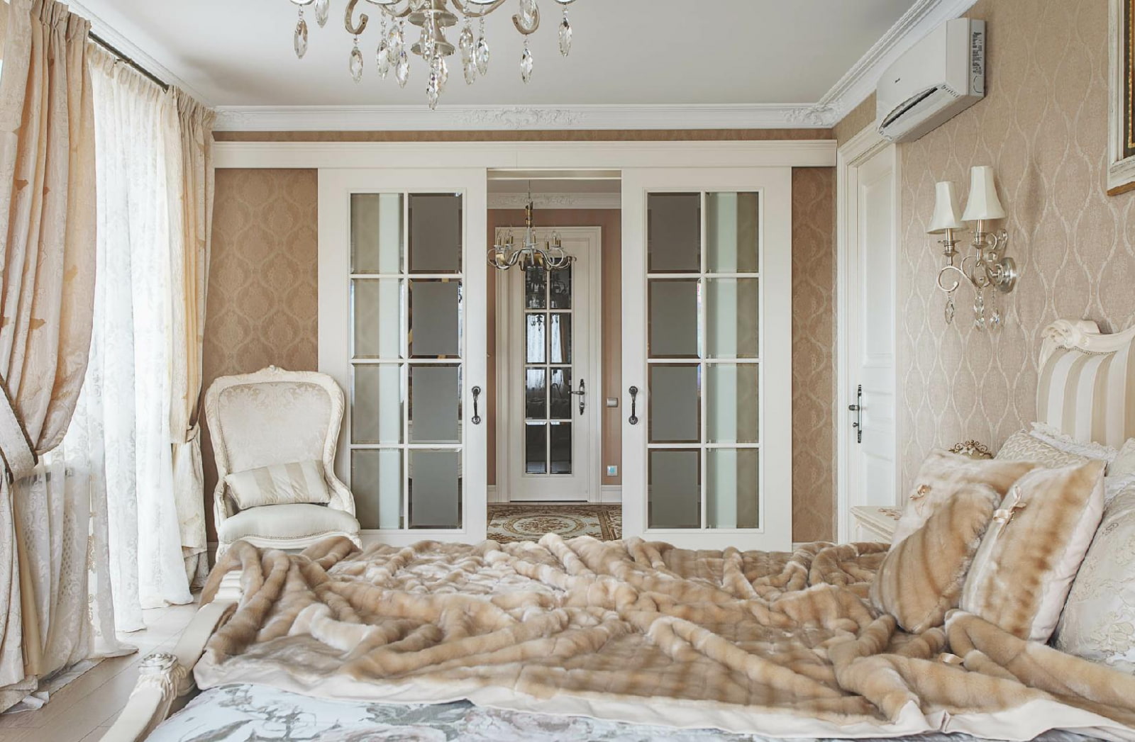 In the photo there are sliding triple doors with frosted glazing in the design of the opening leading to the living room.