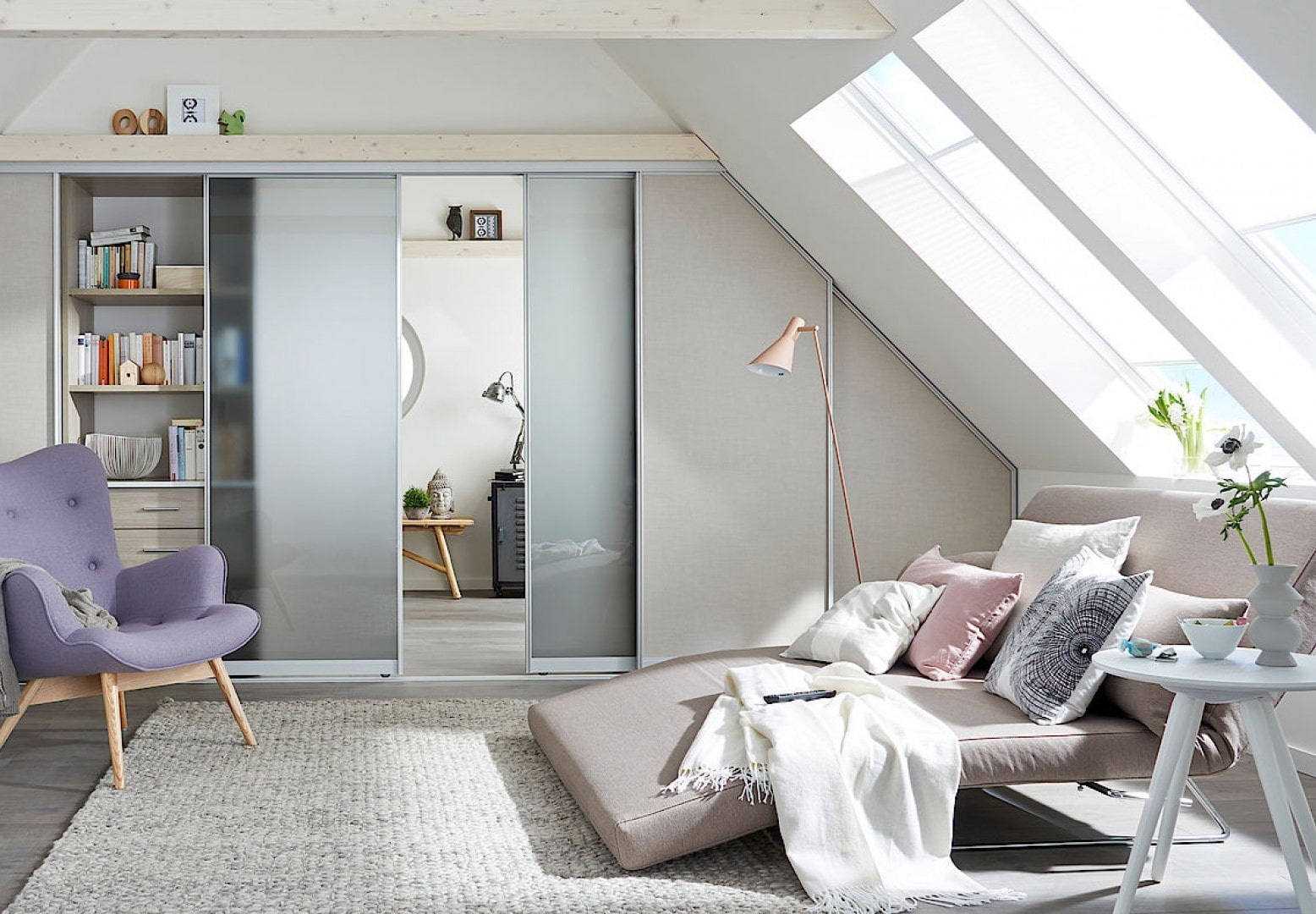 The photo shows the interior of the attic room with sliding compartment doors.