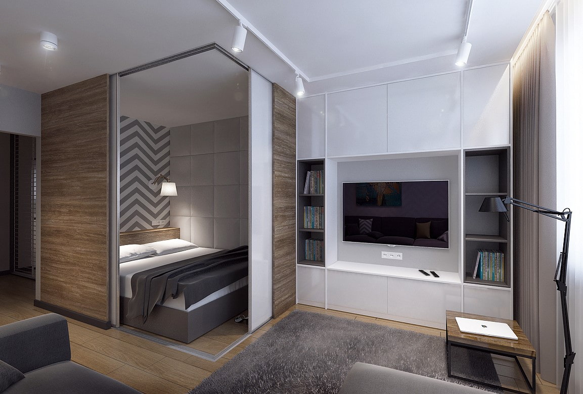 Such a multifunctional sliding partition is perfect for zoning, both a spacious and a small room, and even for visual correction of a narrow and long room.