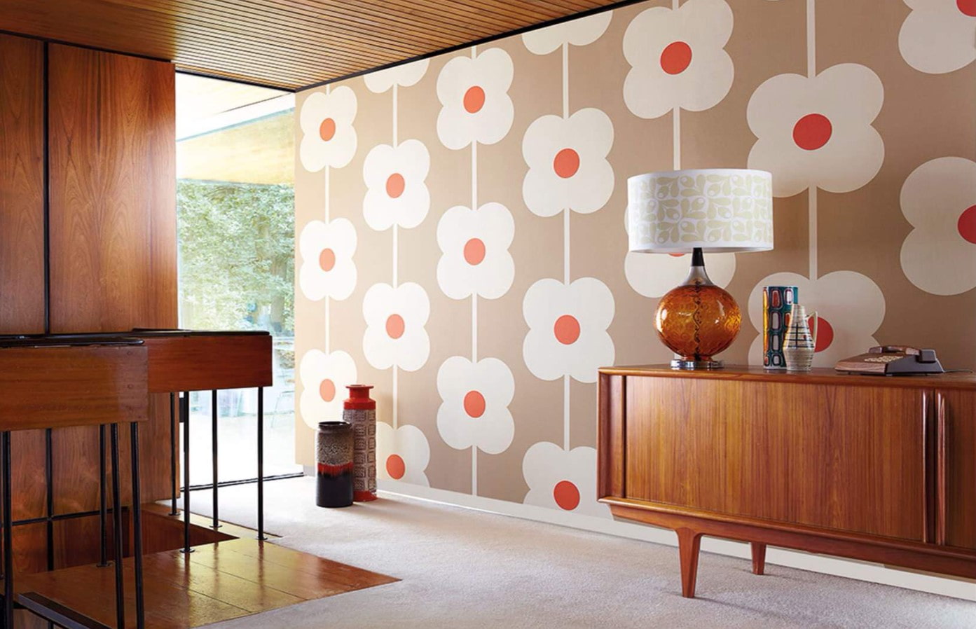 - Prints... Mostly geometric and floral were used. Wallpaper or textiles with characteristic patterns are a retro style feature in the interior.