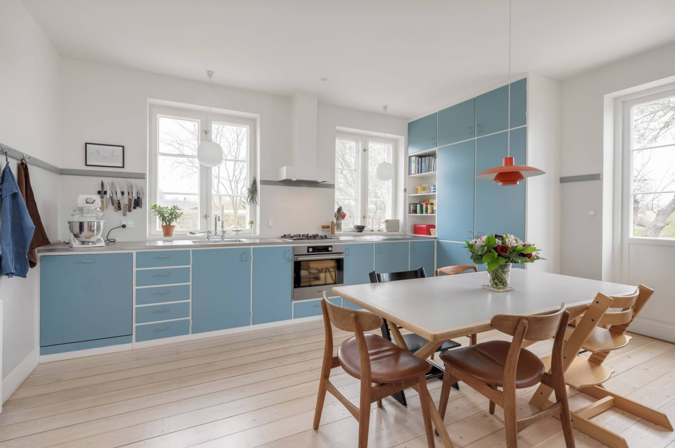 Retro kitchen can be bright - choose a colored set, complement the original chairs in the dining area and a stylish suspension.