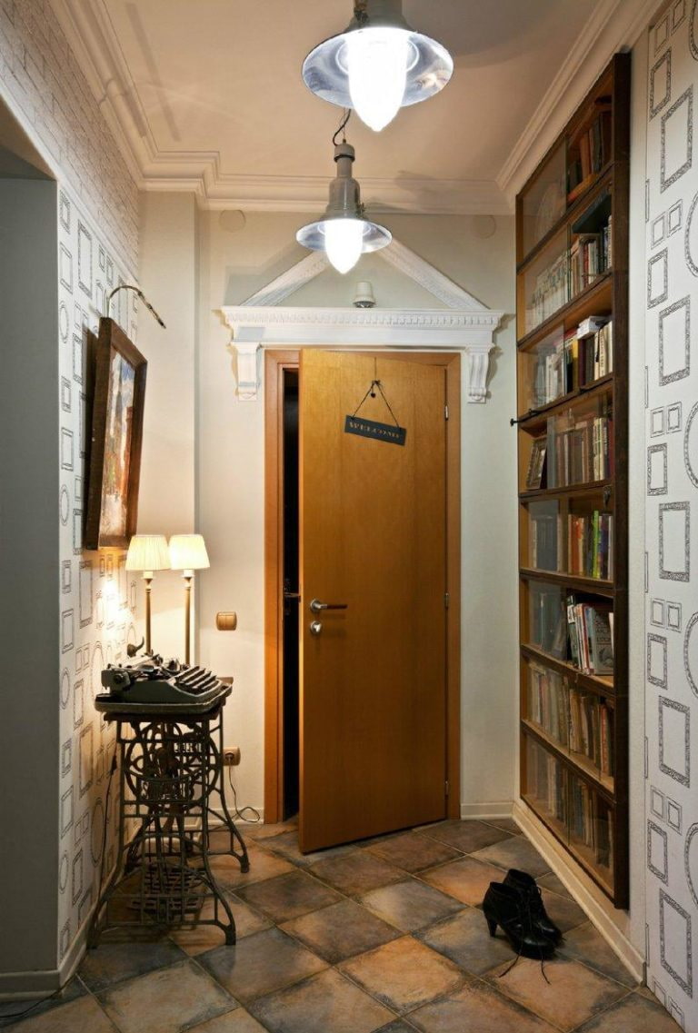 In a retro hallway, you can give free rein to imagination and place original objects instead of a wardrobe, such as a table created from the underframe of a sewing machine.