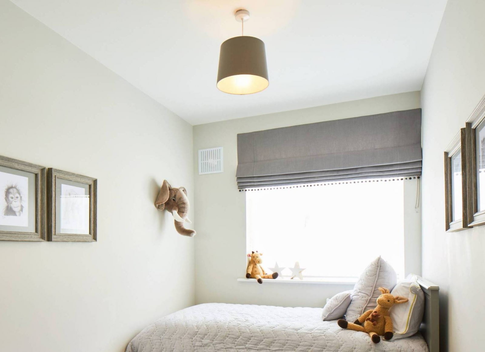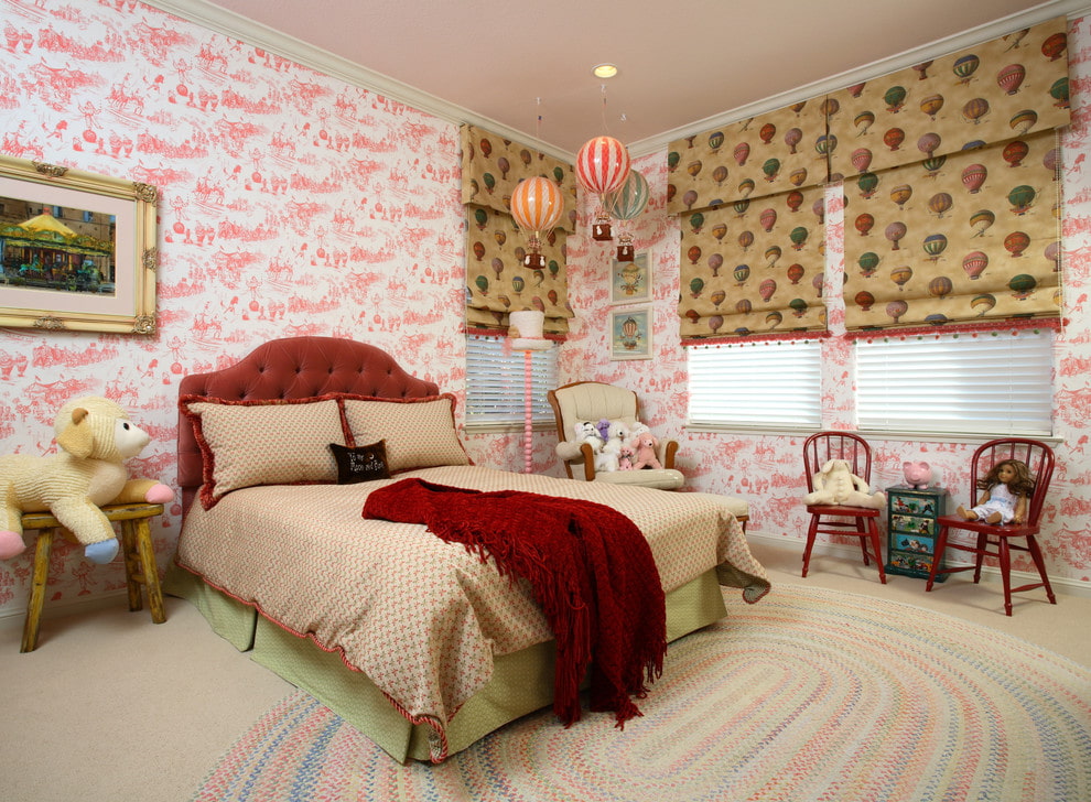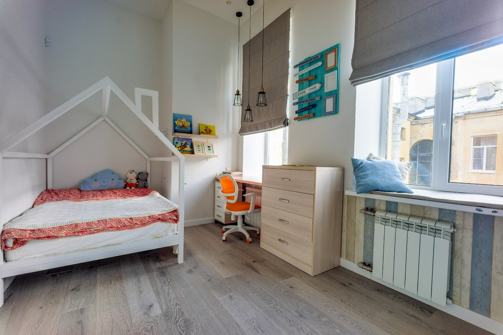 In the photo there are Roman blinds with drawings on the window openings in the nursery.