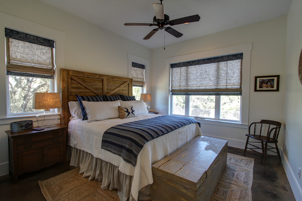 Pictured is a country-style bedroom and linen roman blinds on the windows.