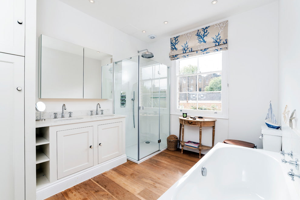 The photo shows a bathroom in light colors and Roman curtains decorated with drawings.