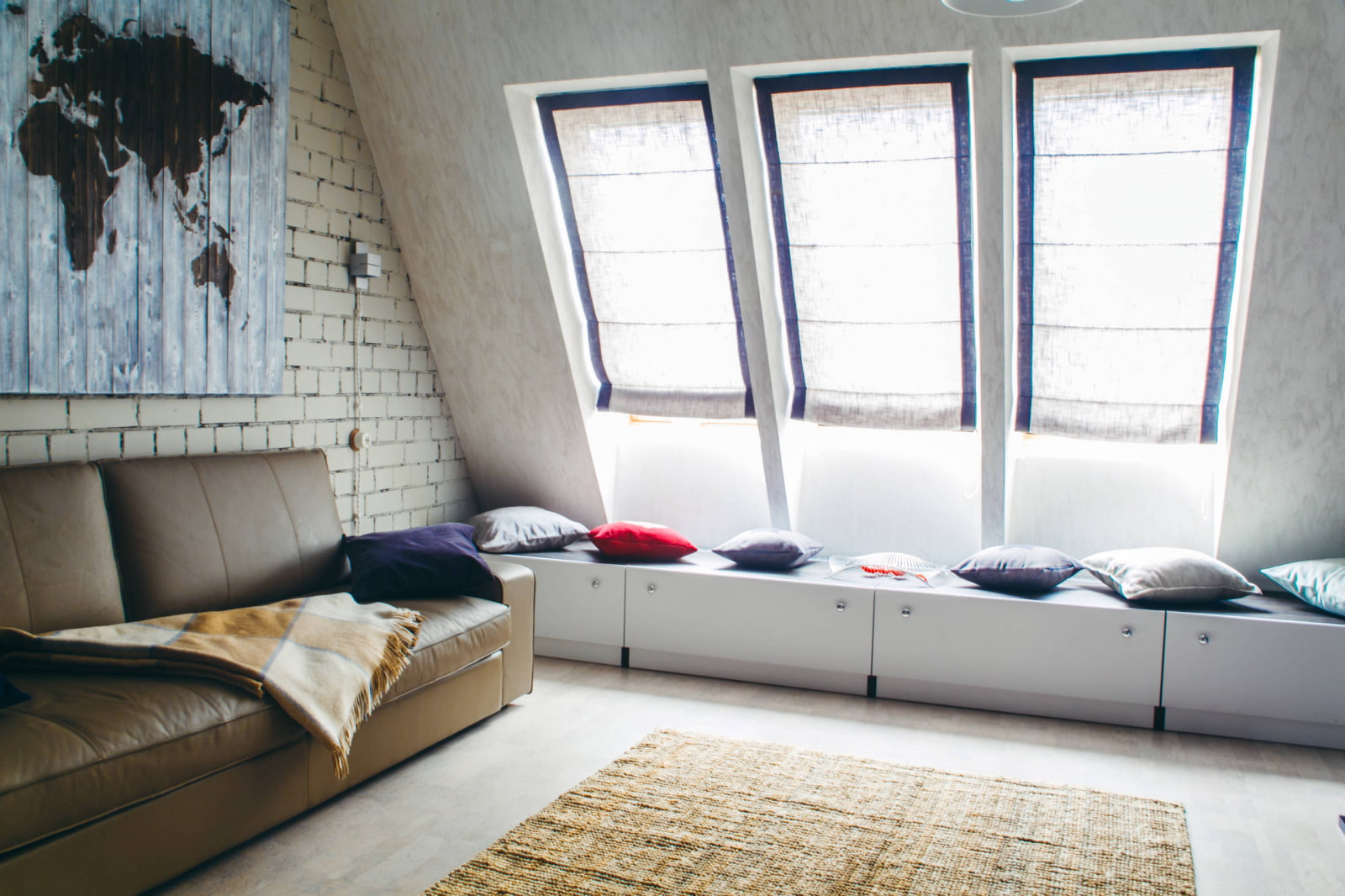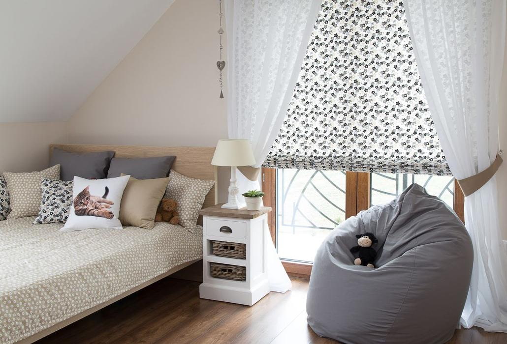 Curtains for slanting windows perfectly highlight and emphasize a non-standard shape. The only drawback of this decor is that it will not be possible to open completely Roman curtains.