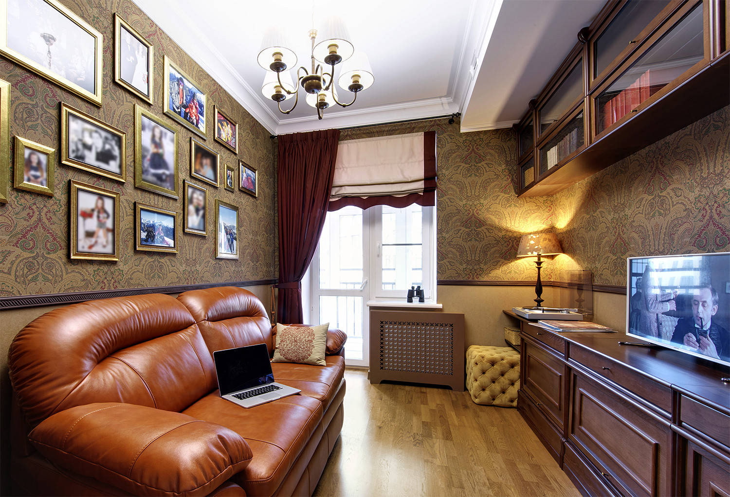 In the photo is a classic-style office and Roman canvases with drawings in the form of birds.